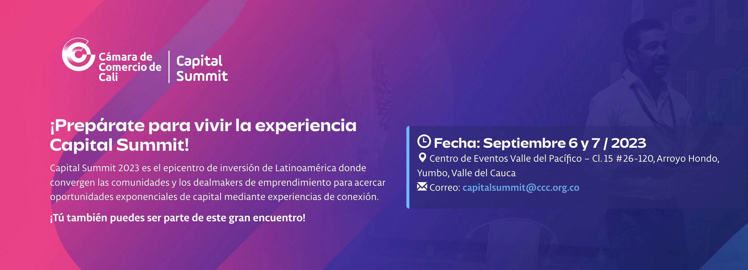 Los próximos 6 y 7 de septiembre, el Centro de Eventos Valle del Pacífico en Cali se transformará en el epicentro de la inversión y la innovación en Latinoamérica al acoger una nueva edición del Capital Summit 2023. Este evento de gran relevancia reúne a emprendedores, inversionistas, expertos y líderes del ecosistema startup y de negocios no solo de Colombia, sino de toda la región. En esta edición, el objetivo es conectar a más de 2.000 asistentes presenciales en un entorno propicio para la inversión, el aprendizaje y la inspiración.